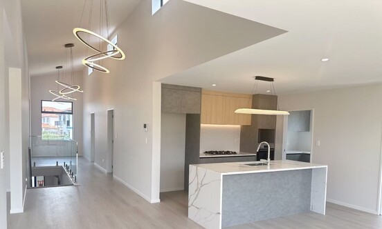 The upper level is the heart of the home, featuring a sun filled open plan living, dining, and kitchen area. The sleek, contemporary kitchen is a chef's dream with premium appliances, sophisticated finishes, and a walk in pantry for effortless organisation . The spacious lounge offers a cozy retreat for family gatherings.