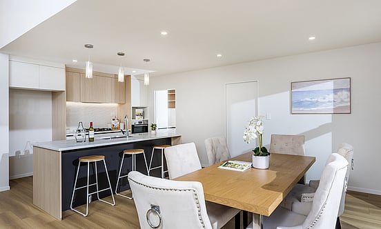 The upper level is the heart of the home, featuring a sun filled open plan living, dining, and kitchen area. The sleek, contemporary kitchen is a chef's dream with premium appliances, sophisticated finishes, and a walk in pantry for effortless organisation . The spacious lounge offers a cozy retreat for family gatherings.