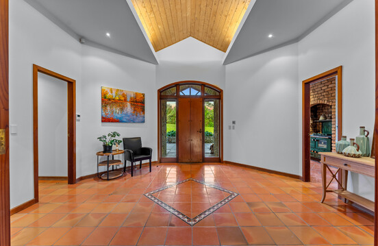 The grand vaulted entrance foyer sets the tone for what's to come - multiple living and entertaining spaces that flow effortlessly to expansive patios. Outdoors, the grounds are as functional as they are beautiful, featuring a fenced orchard, chook house, and generous vegetable gardens.
